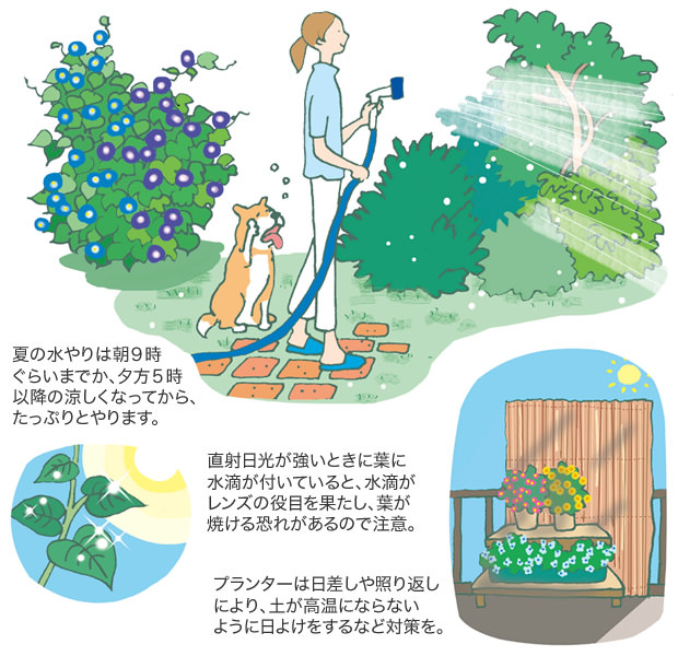 夏の水やりは朝9時ぐらいまでか、夕方5時以降の涼しくなってから、たっぷりとやります。/直射日光が強いときに葉に水滴が付いていると、水滴がレンズの役目を果たし、葉が焼ける恐れがあるので注意。/プランターは日差しや照り返しにより、土が高溫にならないように日よけをするなど対策を。