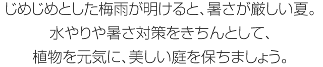 じめじめとした梅雨が明けると、暑さが厳しい夏。水やりや暑さ対策をきちんとして、植物を元気に、美しい庭を保ちましょう。