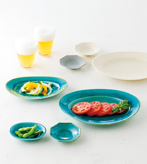 ブランド名の「あわび」は、淡路島の美しさという意味。作家の岡本純一さんは、受け継ぐ器をコンセプトに、江戸後期から明治期に栄えた珉平焼(淡路焼)の制作スタイルに學(xué)びながら日用食器を手掛ける。オーバル皿M(トルコブルー、アイボリーマット)約26×19×H4cm、オーバル皿S(トルコブルー)約21×14×H3cm、八角豆皿(アイボリーマット、青マット、トルコブルー)約9.3×9.3×H2.2cm、楕円豆皿(トルコブルー)約10.6×8.7×H2.5cm。