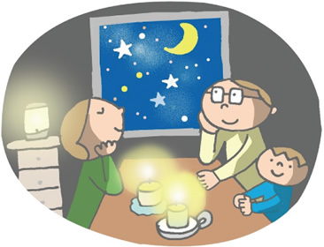 夜になっても照明をつけずに、ろうそくの火やLEDランプ、懐中電燈などで過ごしてみましょう。ただし火の扱いには十分注意を。