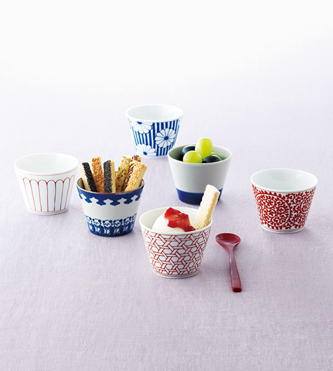 古伊萬(wàn)里のふるさと、長(zhǎng)崎県波佐見町で伝統(tǒng)的な技法を生かし、古典柄から現(xiàn)代的なデザインまで多彩なそばちょこを制作。和文/赤(蛸唐草文〈寫真右〉、籠目文〈手前中央〉、菊弁文〈左〉、和文/青(菊花文〈中央奧〉)、明治銅版唐子図(百子堂文〈左から2つ目〉)、呉須巻(下巻〈右から2つ目〉)、いずれもサイズ直徑8×高さ6.1cm、容量170cc。