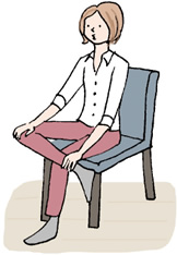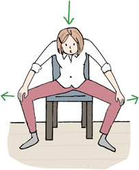 椅子に淺めに腰掛け、両足を膝とつま先が同じ方向を向くように、大きく開く。