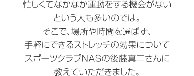 忙しくてなかなか運動をする機會がないという人も多いのでは。そこで、場所や時間を選ばず、手軽にできるストレッチの効果についてスポーツクラブNASの後藤真二さんに教えていただきました。