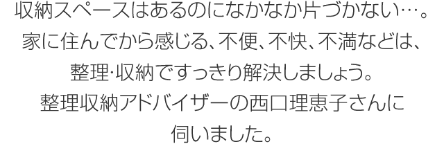 収納スペースはあるのになかなか片づかない…。家に住んでから感じる、不便、不快、不満などは、整理?収納ですっきり解決しましょう。整理収納アドバイザーの西口理恵子さんに伺いました。