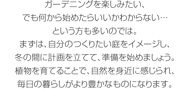 ![[住まいかた暮らしかた]春から始める、ガーデニング](images/comfortableLife/title.jpg)