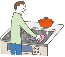 コンロまわりは、調理後の予熱で溫かいうちに、飛び散った油や煮汁などを拭き取っておきます。