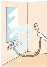 各自が風呂から上がるときに、飛び散ったシャンプーや石けんなどをシャワーで洗い流しておくだけでも汚れを減らせます。洗面器、椅子なども忘れずに。