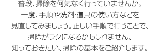 汚れの種類によって、掃除方法が異なります。掃除する場所の材質を確認し、 洗剤や道具を使い分けて効率よくきれいにしましょう。