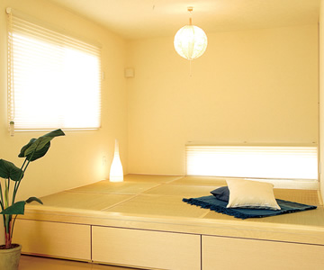 床をアップさせたタタミコーナー。下に収納を設けてスペースを有効活用。座面に腰をかけることもできる。
