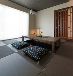 モノトーンの畳を用いた、スタイリッシュな空間。