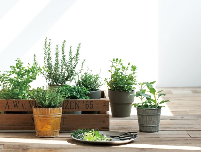 1種類ずつプランターに植えて木箱にまとめると寄せ植え風に。料理にはローズマリーやタイム、セージ、ハーブティーにはミントやレモンバームなどがおすすめです。