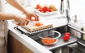 調理と後片付けをサポートするシンク。2段のレーンとプレート、水切りかごを組み合わせることでシンクが立體的に使える。