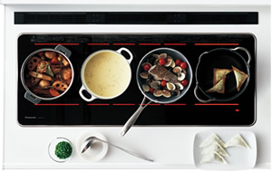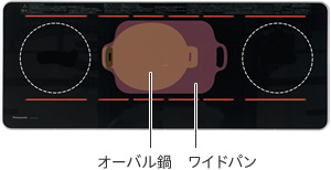 中央のヒーターは鍋の大きさに合わせて、加熱範囲が変えられる。オーバル型の鍋や大きなフライパンも使用可能。