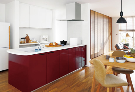 カウンターやキャビネットなどの素材やカラーのバリエーションも豊富に。キッチンもインテリアの一部として、ダイニングやリビングとコーディネートすることで、統一感のある空間になります。