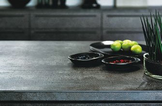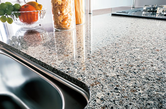 人造石天板。天然石の風合いが高級感を醸す。汚れが染み込みにくく衛生的で傷つきにくい。
