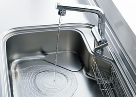 野菜クズや油汚れが水流にのって、排水口へ流れるので、汚れにくく、洗いやすいシンク。