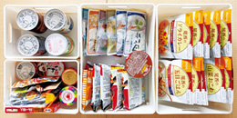 置き場所と備蓄する物を決めたら、種類ごとに分類して、取り出しやすい収納を工夫しましょう。「わが家では、押し入れに棚を設置し、重い物は下、軽い物は上に収納。種類ごとに分類して、ケースに入れています」と三原さん。食事の1食分の獻立を考えながら、主食、おかず、汁物などに分類しておけば、買い足しが必要かどうかも一目で分かります。「棚には飛び出し防止のためにネットを掛け、普段はふすまを閉めています」