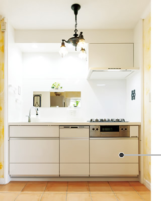 すっきりと片付いた三原さんのキッチン。床やカウンターに物を出さないようにし、落下物が心配な吊り戸棚は撤去。