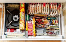賞味期限が1年以內の食品は、表示が一目で分かるように並べてキッチンの引き出しにストック。カセットコンロやラップ、割り箸などのカトラリー類もまとめて収納。