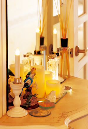 いろいろな場所に配置されたLEDキャンドルは、インテリアとして楽しみながら、非常時の明かりとしても役立つ。