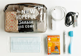 「外出先での被災に備え、非常用グッズをポーチにまとめ普段から持ち歩いています」と三原さん。攜帯充電器、ホイッスル、マスク、防寒用アルミシート、歯ブラシ、筆記用具、連絡先を記入したカードなどを中身が見えるポーチにコンパクトにまとめています。