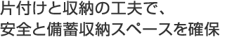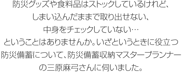 「物が散亂していると、いざというときにケガをしたり、逃げ遅れたりすることにもなりかねません。また、せっかく備蓄していても、その前に家具が転倒していたら、取り出せません」。まずは、収納を見直し、住まいの安全を確保。そして物の指定席を決め、不要な物を処分すれば、空いたスペースを備蓄収納に活用することができます。「すっきりと片付けると同時に、今ある物もストックとして災害時に生かすことも考えてみましょう」