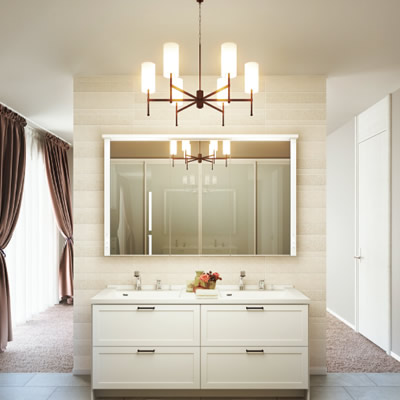タッチレスの照明や水栓などの最新アイテムと大容量の収納を備え、デザイン性と機(jī)能性を両立した洗面室。