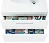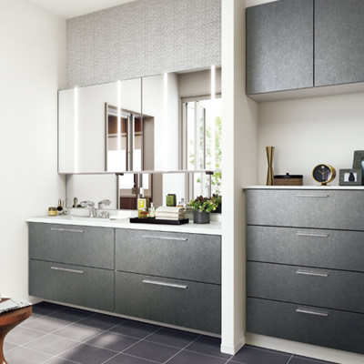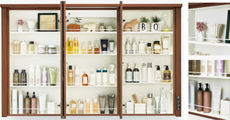 家族それぞれの小物やストック類などをたっぷり収納できるキャビネットで、雑然としがちな洗面室がすっきりと片付きます。