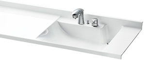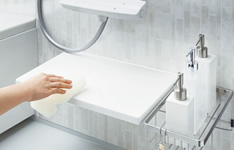 水あかや汚れが付きにくい「有機(jī)ガラス系新素材」を使用。カウンターはフラットで掃除しやすく、水栓は継ぎ目が少なく水滴が流れやすいなめらかなデザイン。