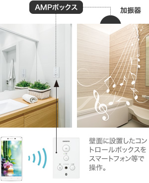 加振器によって音を発生させ、バスルーム全體に音楽が流れる。