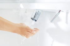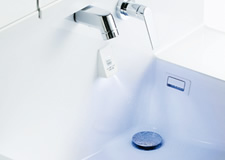 手を差し出すとすぐにお湯が出る即湯水栓は捨て水がなくエコ。