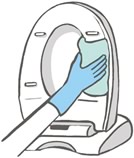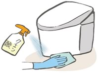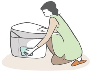 ホコリや水あかがたまりやすい場所。やわらかい布で水拭きをします。陶器製の場合は、こびり付いた汚れはクレンザーを付けてこすります。その際、タンクの中に入らないように、拭き取ってから、水を流しましょう。