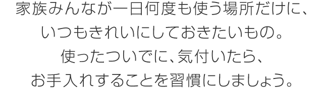 家族みんなが一日何度も使う場所だけに、いつもきれいにしておきたいもの。使ったついでに、気付いたら、お手入れすることを習(xí)慣にしましょう。