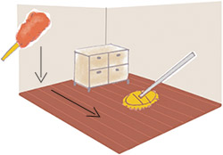 掃除した場所を汚さないように、天井、照明、家具?壁の順にホコリを払い、奧から入口へ向かって、床掃除を行います。