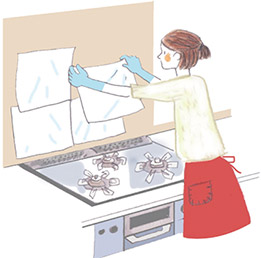 油煙で汚れが意外と広範囲に広がっています。頑固な汚れはキッチンペーパーに洗剤を含ませて濕布し、汚れをゆるめます。水拭きで汚れを拭き取った後、乾拭きをしましょう。