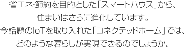 省エネ?節(jié)約を目的とした「スマートハウス」から、住まいはさらに進(jìn)化しています。今話題のIoTを取り入れた「コネクテッドホーム」では、どのような暮らしが実現(xiàn)できるのでしょうか。