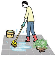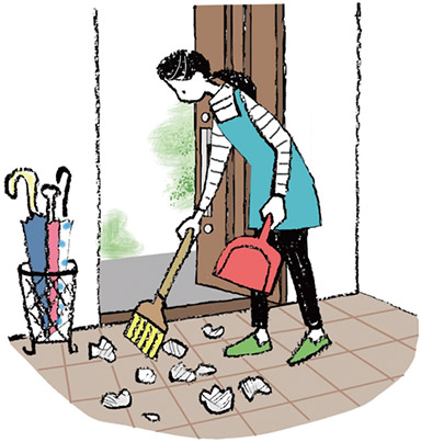 ドアや壁、シューズボックスは週に1度、ハンディーモップなどでホコリを取ります。その後、たたきにたまった土や砂、ホコリをほうきか掃除機(jī)で取り除きましょう。濡らした新聞紙を小さくちぎったものを床にまいてからほうきで掃くと、細(xì)かいホコリを舞い上げることなく、掃くことができます。