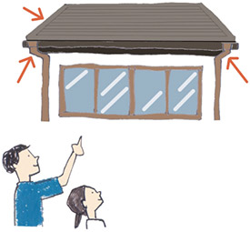 屋根まわりの破損や瓦のズレ、雨樋の詰まりがないか、目で見てチェック。臺風に備えて、早めの點検で被害を最小限に。