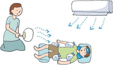 風(fēng)通しのよい日陰や冷房が効いている室內(nèi)に避難させます。衣服をゆるめ、うちわや扇風(fēng)機で風(fēng)を當(dāng)て、首筋、脇の下、股関節(jié)などを氷などで冷やします。