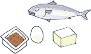 體を動かすエネルギー源となるタンパク質(zhì)を含む、肉類や魚介類、豆類、卵、乳製品などをしっかり摂り、筋肉の疲労回復(fù)、基礎(chǔ)代謝アップに。