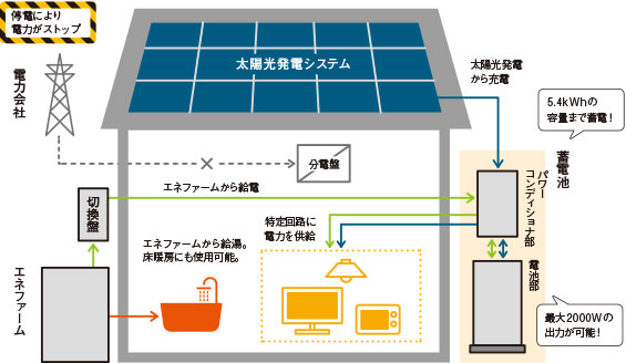 停電対策では、停電時や悪天候でも、ガスが供給されていれば「エネファーム※1」での発電が可能な「全天候型3電池連攜システム」を採用。停電が長期化しても、できるだけ普段通りの生活を維持するために備えることで、精神面も體力面もサポートします。