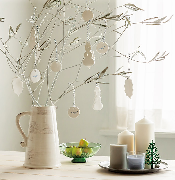 季節を感じさせるしつらえをわが家に取り入れてみませんか?日常生活の中で心が和み?またその時季の行事を楽しむきっかけにもなります?今回は小さなスペースでも飾れるクリスマスディスプレイの提案です?白い水差しに白くペイントしたオリーブの枝をツリー代わりに挿し?傍らには同じく白を基調にしたキャンドルを飾りました?ツリーにつるしたオーナメントは?軽量紙粘土をクッキー型で抜いたもの?簡単なので子どもたちと一緒に手作りしてもいいですね?さあ?今晩は家族そろってクリスマスディナーを楽しみましょうか?