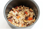 かさが薄い香信しいたけを手で砕き、切り干し大根と、米と一緒に水に浸して直接炊き込みます。