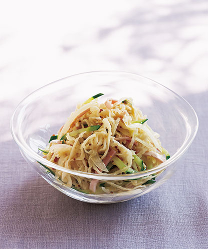 - ❷ きゅうり、ハムはせん切りにする。玉ねぎは水にさらし、水気を切る。