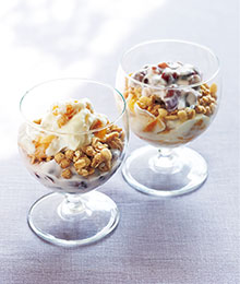 ドライマンゴー30g、ドライベリー(クランベリー)30gを無糖ヨーグルト各90gと混ぜ、冷蔵庫で一晩置く。器にグラノーラ適量と一緒に盛る。