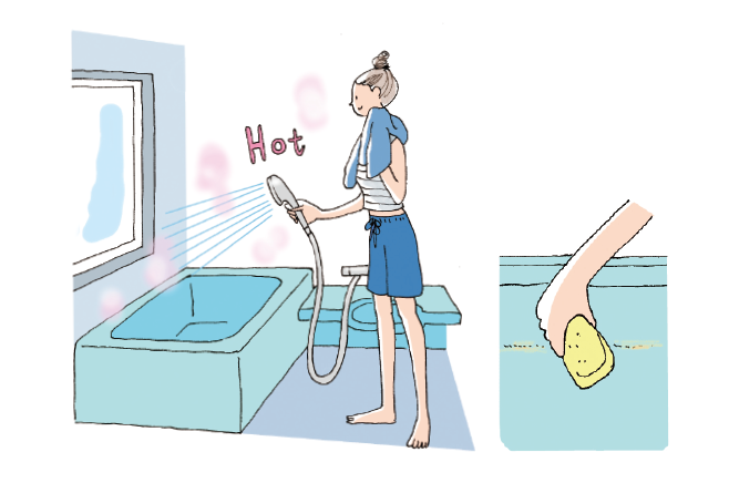 浴室全體に冷たいシャワーをかけ、溫度を下げておくと、カビの発生予防になる。
