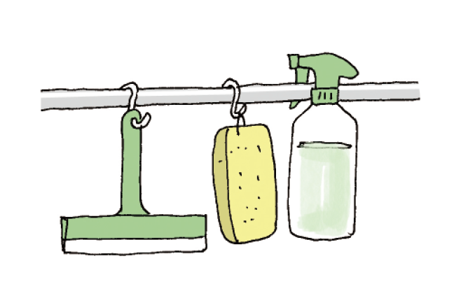 すぐに掃除できるように手の屆くところにスポンジや浴室用中性洗剤を用意。床に置かずにつるしておくと、ぬめり予防に。