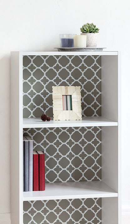 シンプルな白い棚が、背板にシール壁紙を貼るだけでぐんとおしゃれになります。組み立てる前または板を分解した狀態で貼るときれいに仕上がります。