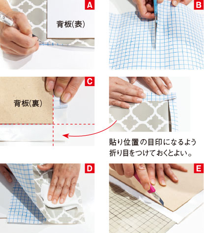 ❶シール壁紙の表側に背板を置いて柄の配置を決め、えんぴつで印を付けるA。