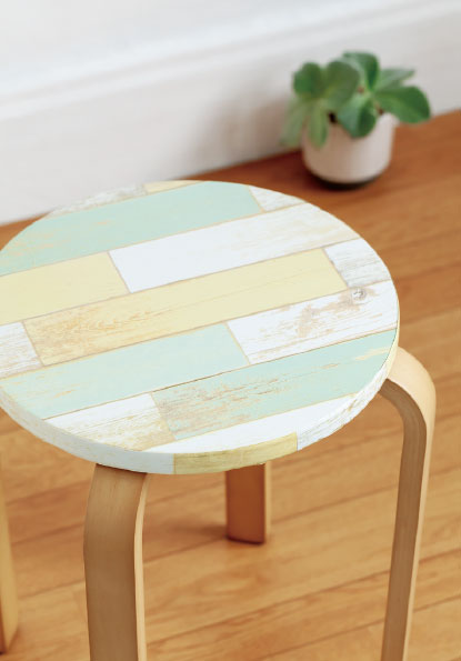 スツールの座面にヴィンテージテイストのシール壁紙を貼って、部屋のアクセントに。ティーカップをのせたり、花を飾ったり、サイドテーブルとしても活躍しそう。